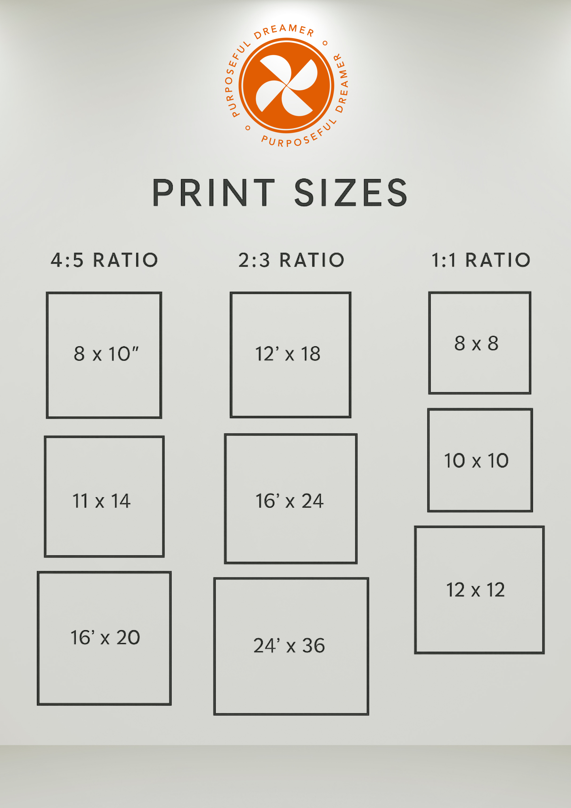 - 2:3 ratio (12x18”, 16x24”, 20x30”, 24x36”, etc.)
